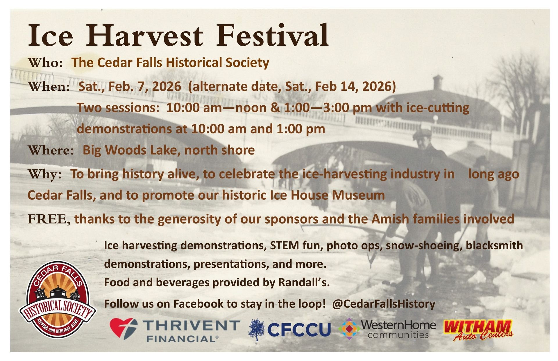 Join the Cedar Falls Historical Society on Big Woods Lake's north shore for ice harvesting demonstrations, ice carving, activities for kids, snow shoeing, blacksmithing demonstrations, ice fishing presentations, and more! The event will take place from 10:00 a.m.-3:00 p.m., with ice harvesting demonstrations at 10:00 a.m. and 1:00 p.m. The event is free to attend, and food will be available for purchase. The event has a backup date of February 14 if weather conditions are not favorable on the 7th.